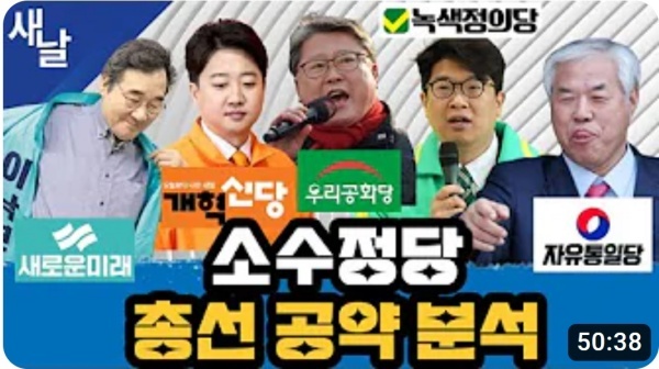 ▲ 소수정당 정책 공약 평가(개혁신당, 새로운미래, 자유통일당, 녹색정의당, 우리공화당)[출처=새날유튜브]