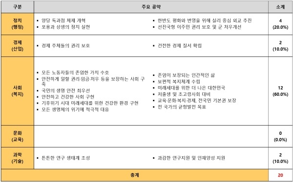 다음으로 △정치(행정) 공약 20.0% △경제(산업) 공약 10.0% △과학(기술) 공약 10.0% △문화(교육) 공약 0.0%를 각각 기록했다.