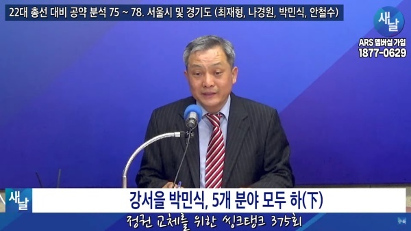 2024년 04월02일(화요일) 새날 유튜브 방송은 2024년 제22대 국회의원 선거에서 출마하는 서울시 강서을 박민식 후보가 제시하는 선거공약을 평가했다. 평가를 위한 방송에는 푸른나무, 이상구 원장, 민진규 소장(국가정보전략연구소)이 출연했다.