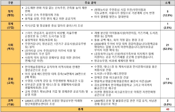 공약은 정치(행정)(5)·경제(산업)(1)·사회(복지)(21)·문화(교육)(11)·과학(기술)(2) 등으로 구성됐으며 △ 사회(복지) 공약 52.5% △ 문화(교육) 공약 27.5%를 각각 차지했다. 다음으로 △정치(행정) 공약 12.5% △과학(기술) 공약 5.0% △경제(산업) 공약 2.5%를 각각 기록했다.