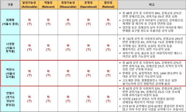 박민식 후보가 제시한 40개 공약은 △달성가능성 △적절성 △측정가능성 △운영성 △합리성 영역 등 5개 영역 모두 최하인 하(下) 평점을 받았다.