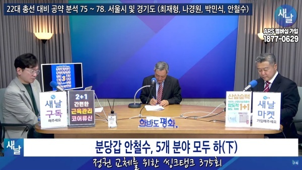 2024년 04월02일(화요일) 새날 유튜브 방송은 2024년 제22대 국회의원 선거에서 출마하는 경기도 성남시 분당갑 안철수 후보가 제시하는 선거공약을 평가했다. 평가를 위한 방송에는 푸른나무, 이상구 원장, 민진규 소장(국가정보전략연구소)이 출연했다.