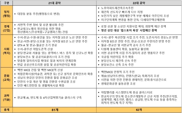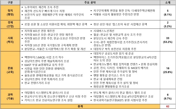 공약은 정치(행정)(5)·경제(산업)(2)·사회(복지)(33)·문화(교육)(16)·과학(기술)(6) 등으로 구성됐으며 사회(복지) 공약이 전체의 53.2%를 차지했다.