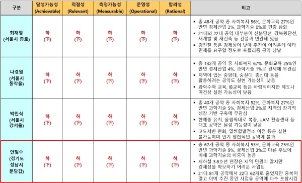 안철수 후보가 제시한 62개 공약은 △달성가능성 △적절성 △측정가능성 △운영성 △합리성 영역 등 5개 영역 모두 최하인 하(下) 평점을 받았다.