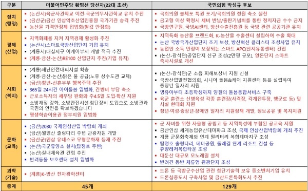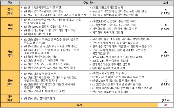참고로 22대 총선에서 초선으로 당선된 황명선 당선자와 경쟁한 박성규 후보가 제시한 공약은 129개며 정치(행정)(6)·경제(산업)(30)·사회(복지)(35)·문화(교육)(56)·과학(기술)(2)등으로 구성됐다.