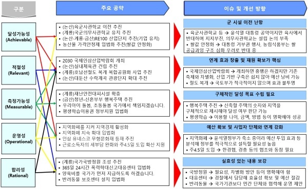 황명선 당선자가 제시한 45개 공약을 △달성가능성 △적절성 △측정가능성 △운영성 △합리성 영역 등 5개 영역으로 분석했다.