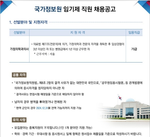 ▲ 2024년도 국가정보원 임기제 직원(가정의학과의사) 채용 공고[출처=국가정보원 채용사이트]