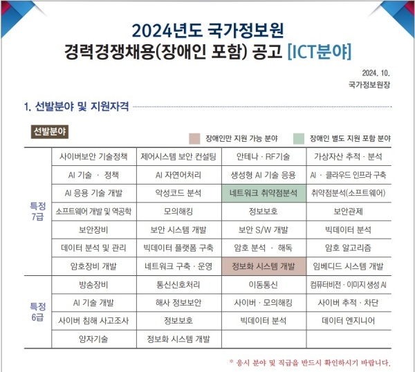 ▲ 2024년도 국가정보원 경력경쟁 채용(장애인 포함) 공고(특정직 6·7급 ICT분야) 안내[출처=국가정보원]