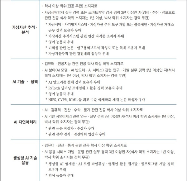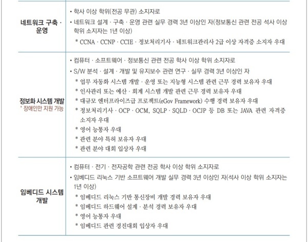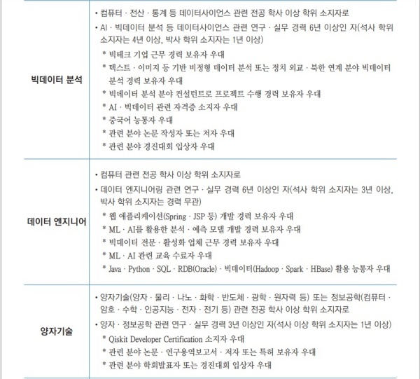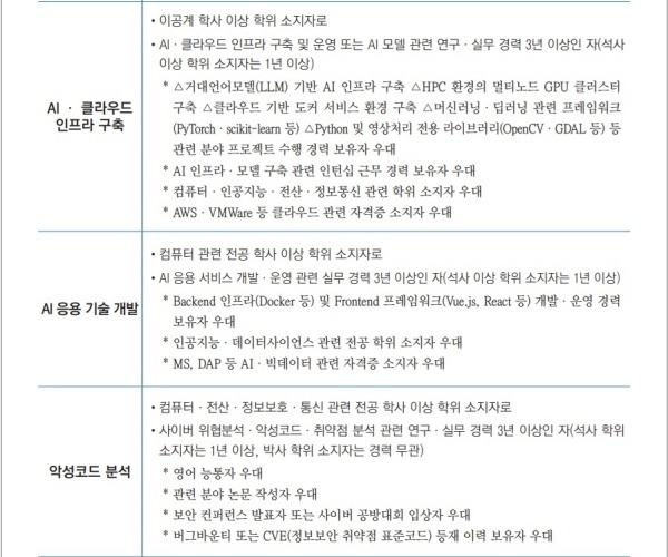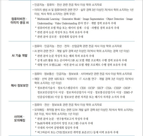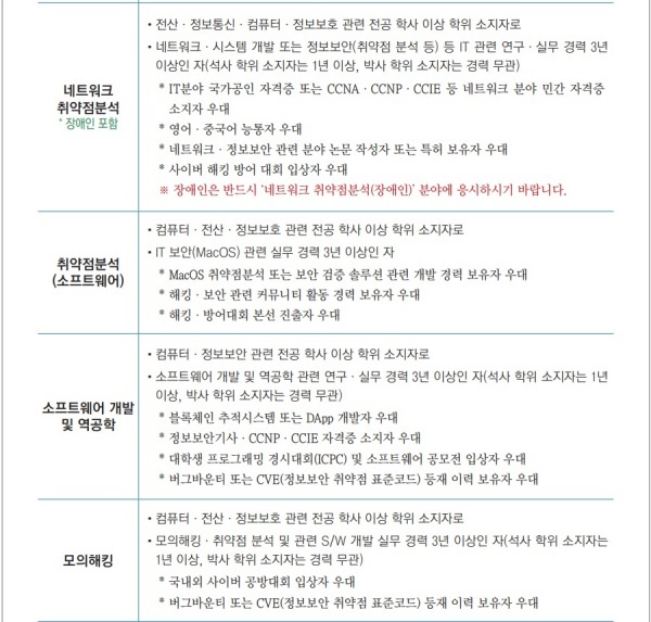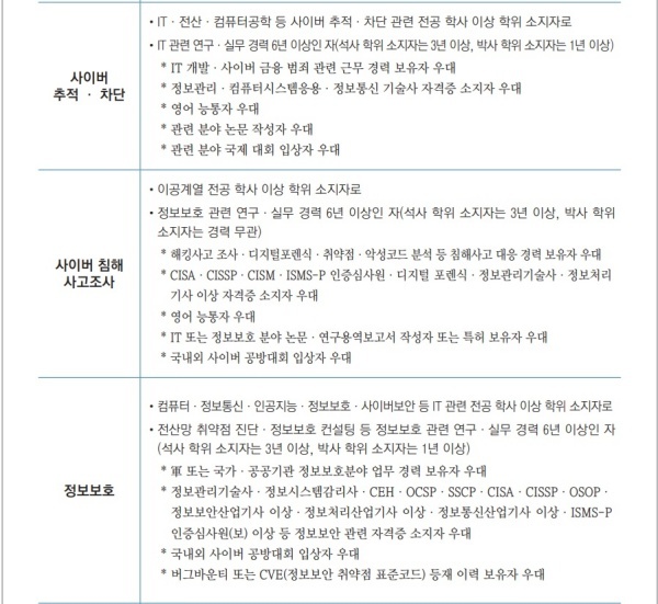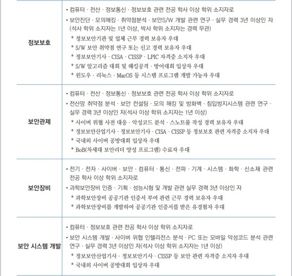 •정보보호·신기술 관련 연구·실무 경력 3년 이상인 자(석사 학위 소지자는 1년 이상, 박사 학위 소지자는 경력 무관)