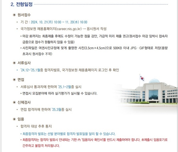 ■ 서류심사 : 2024.12.~'25.1월중 합격자 발표, 국가정보원 채용홈페이지 로그인 후 확인