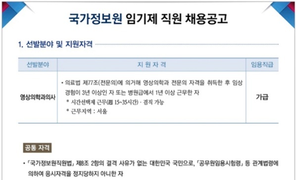 ▲ 2025년도 국가정보원 임기제 직원 채용공고(영상의학과의사)[출처=국가정보원]
