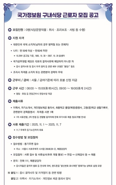 국가정보원 구내식당 근로자 모집 공고(서류 제출기간 : 2025.11.01.~2025.11.07.)