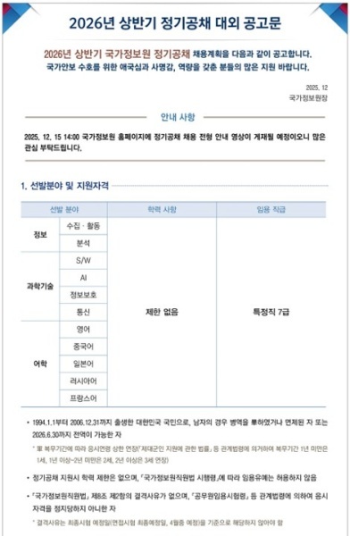 ▲ [국정원 채용 정보] 2026년 상반기 국가정보원 정기공채 공고[2026.1.12(월) 10:00 ~ 1.30(금) 16:00] [출처=국가정보원]