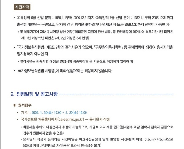[국정원 채용 정보] 2026년도 국가정보원 경력경쟁채용 공고(원서접수 : 2026.01.30.(금) 10:00 ~ 02.20.(금) 16:00)
