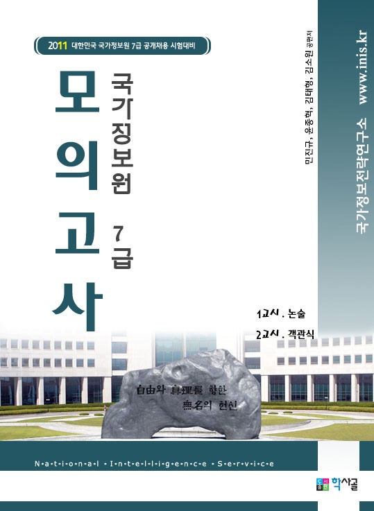마침내 이번에는 수험생들이 자신의 실력을 최종적으로 점검하고 부족한 부문을 보완할 수 있도록 ‘국정원합격 모의고사집(민진규, 윤종혁, 김태형 편저)’를 출간하게 되었다. 이 책은 2010년 8월 국정원 시험을 준비하는 수험생들을 위해 준비하였으므로, 수험생들은 다음 3가지 주의사항을 참조해서 공부하기를 바란다.