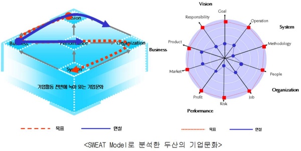 지금까지 설명한 두산의 기업문화를 본인이 개발한 기업문화 측정과 혁신도구인‘SWEAT Model’에 적용해 보면 아래 그림과 같이 나타낼 수 있다.