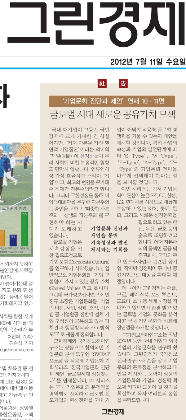 또한, '국가정보전략연구소'와 '그린경제'는 2012년 7월 11일 수요일자 신문부터 '기업문화 진단과 제언'을 통해 지속성장과 발전을 제시하는 기획물을 시리즈로 연재하고 있습니다.