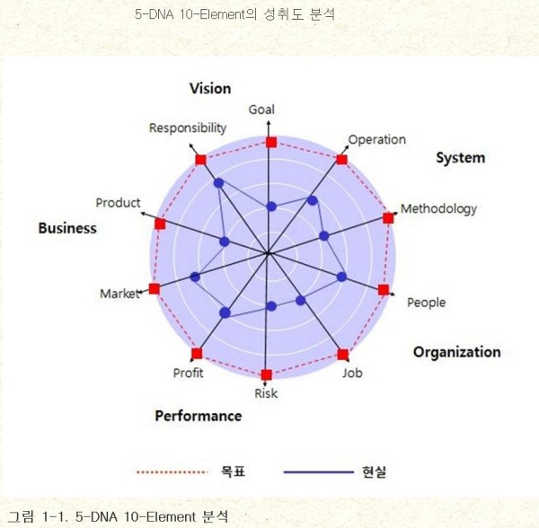 SK의 5-DNA 10-Element를 분석해 보면 [그림 1.1]과 같다. 전 영역 중에서 가장 두드러진 것은 사회적 책임(social responsibility)이다. 최태원 회장이 솔선수범하고 있는 봉사활동, ‘충분한 이익’이라는 개념으로 접근하는 협력업체와의 조화로운 관계 등은 좋은 사례다. 그럼에도 불구하고 기업의 목표(goal), 제품(product), 위험(risk), 일(job), 경영도구(methodology) 영역에서는 낮은 점수를 나타내고 있다.